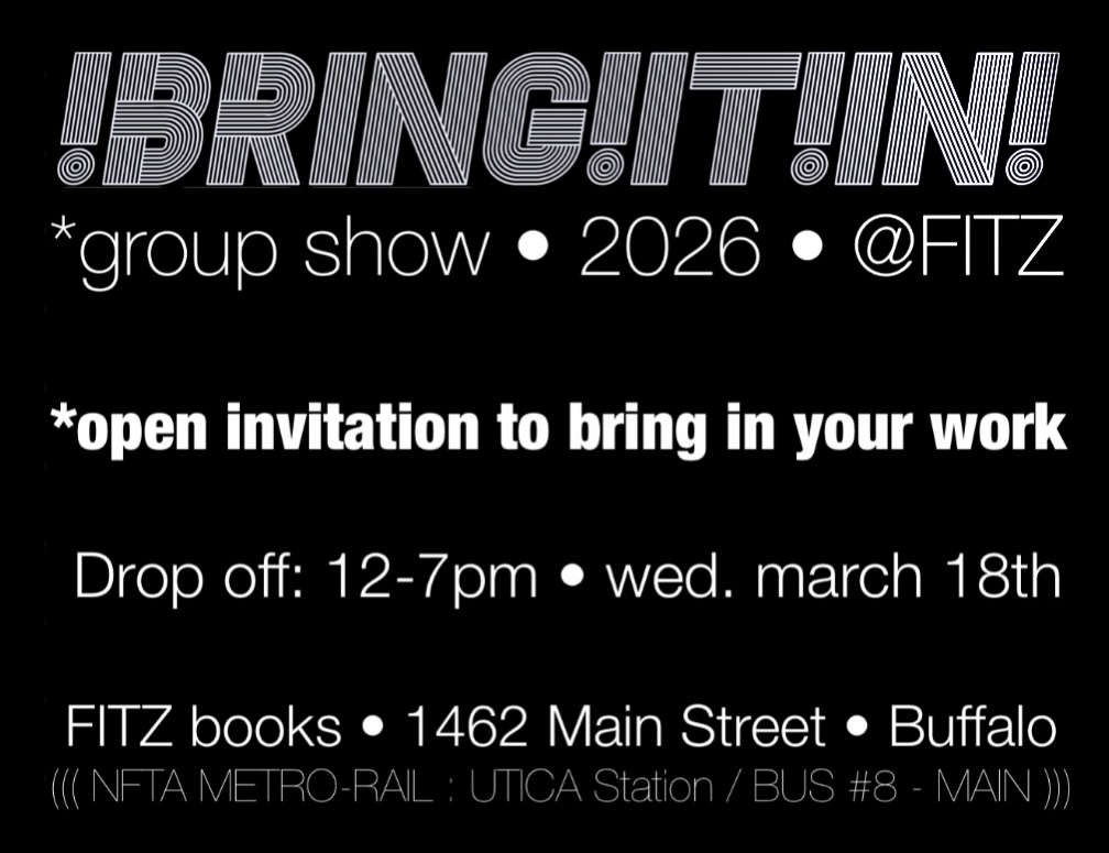 Open Invite Group Show Open invitation to bring in your (art) work! Drop off @ Fitz Books *& Waffles: 12-7pm • wed. march 18th OPENING April 1st FITZ books • 1462 Main Street • Buffalo (((NFTA METRO-RAIL : UTICA Station / BUS #8 – MAIN)))